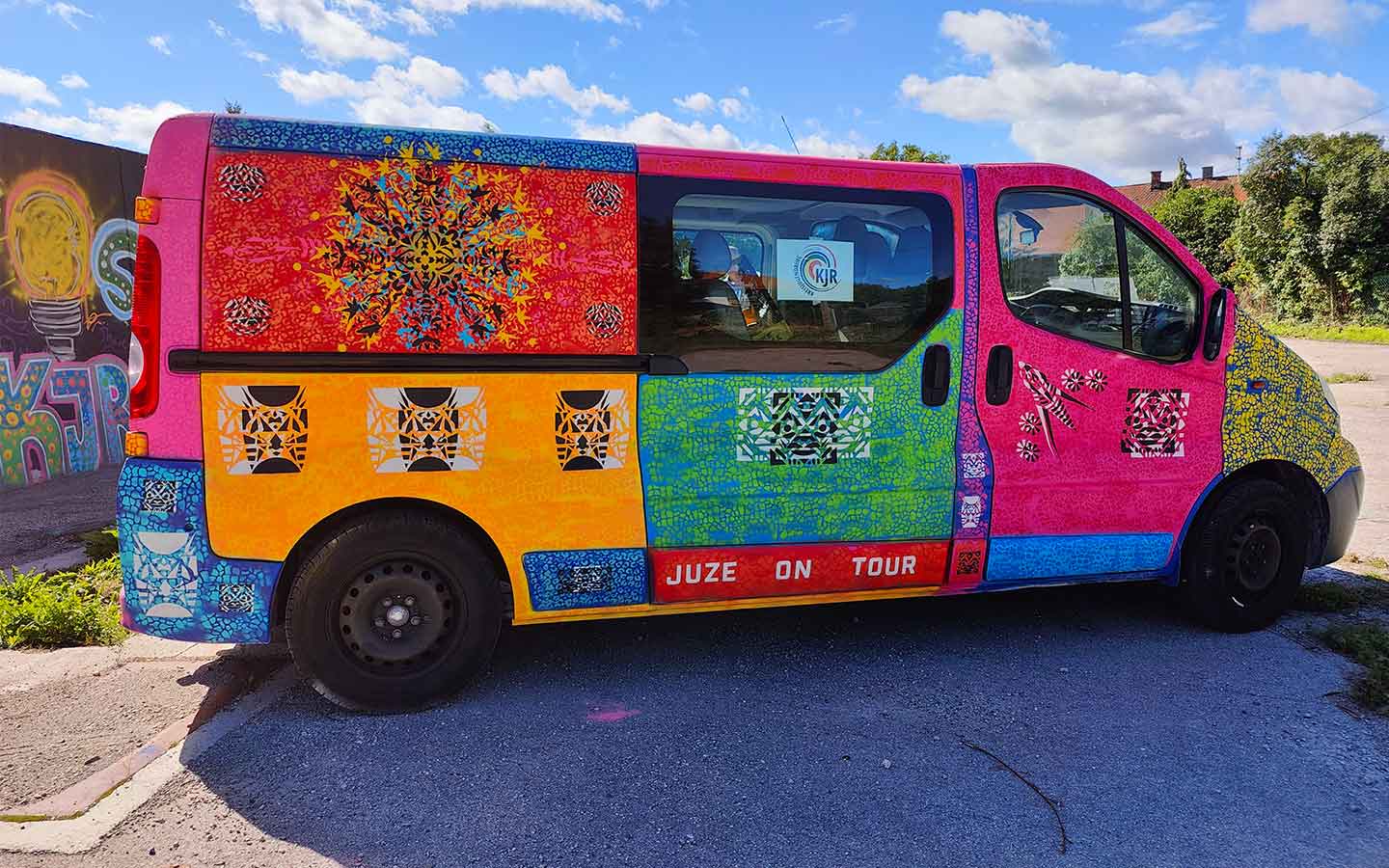 „Ein farbenfroher Hingucker“, so betitelte die Mindelheimer Zeitung die fertige Gestaltung des Juze on Tour Buses vom Kreisjugendringes Unterallgäu. Das aufwendige Kunstprojekt fand in Zusammenarbeit mit dem Kreisjugendring und Renate Rauch vom „Gelben Haus“ in Ettringen. Finanziert wurde das Ganze vom Rotary Club Mindelheim.